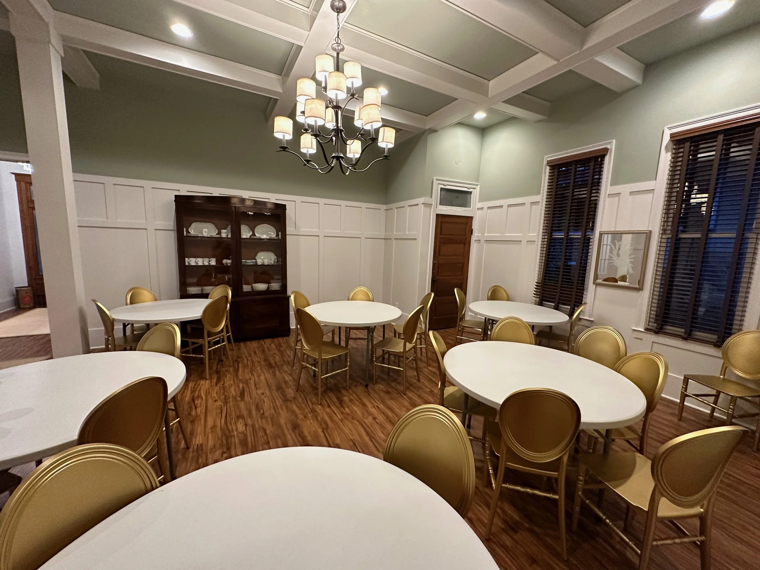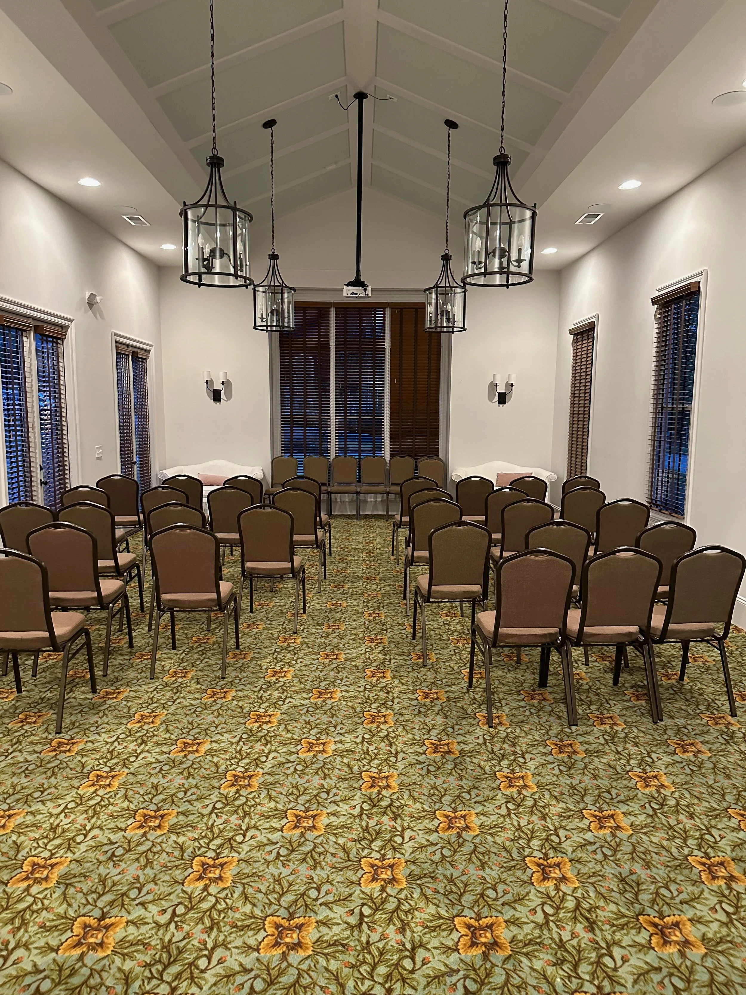 Catering kitchen with large commercial warmer, commercial sinks, Prep area and refrigerator.